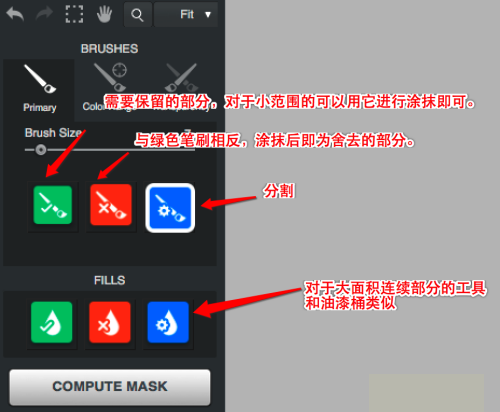 4.所以,只要用保留的笔选中大致区域,变为绿色保留下来;用剪切笔选中大致区域,变为红色将要去除剪切;再用计算笔选中需要抠图的边界区域,用来AI抠图;